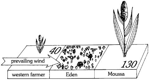 Als Eden damals seine Arbeit in Dalli begann, wurden mehrjährige Gewächse von den Bauern abgehackt oder aus der Erde gezogen. Nachdem die Feldstation eingezäunt worden war, fingen mehrjährige Pflanzen an, aus Samen zu wachsen, die Eden gesät hatte, aus Samen, die sich schon in der Erde befanden und aus den Wurzelwerken abgeholzter Sträucher, von denen einige jetzt über 3m hoch sind. 1992 hatte Moussa, der Bauer östlich der Feldstation, durch seine Methode der Feldbestellung verursacht, dass der Zaun von Eden teilweise mit 80cm Sand bedeckt wurde. Während der trockenen Jahreszeit weht der Wind nämlich hauptsächlich aus seiner Richtung. Aber während der Regenperiode, wenn er seine Hirse sät, wechselt der Wind in die entgegengesetzte Richtung .Dadurch haben seine Felder mehr und mehr Schutz bekommen von den mehrjährigen Gewächsen Edens. Dieses Jahr wurden die Bauern gezwungen, mehrmals zu säen, da der kräftige Wind ihre zarten Pflanzen zerstörte. Moussa dagegen brauchte nur noch einmal auf dem Teil des Feldes zu säen, das am weitesten entfernt von der Feldstation lag. Dadurch wuchs seine Hirse höher und brachte einen größeren Ertrag als die Hirse der anderen Bauern. Moussa erntete mehr als 130 Körbe mit ungefähr 60kg pro Korb. Da er nicht genügend Platz in seiner Getreidekammer hatte, musste er zwei weitere bauen. Die Bauern berichteten, dass dies die größte Ernte war, die in diesem Jahr innerhalb eines Umkreises von 20 km von Dalli registriert worden war. Der Bauer an der entgegengesetzten, ungeschützten Seite der Feldstation, erhielt im Vergleich dazu nur 40 Körbe.