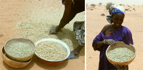 Eden has taught us a lot of things, said Aishatu and Mariama from Maydiga, the teenage daughters of Eden farmer Lawali Haruna. You have taught us about hygiene and to make use of the food that our Eden trees give. Your fruits are our sweets and we can sell them at the market. Thank you! In April, many Eden families were collecting boscia senegalensis fruits. At this time, the fruits were still unripe but the seeds which are consumed as staple food, taste the same whether the fruits are ripe or not. Though the millet had failed, the Eden trees produced food in abundance and boscia senegalensis is an important substitute when the millet is insufficient. In Bubaram, the field workers met Hajara, who was harvesting unripe boscia senegalensis fruits, which she would dry, pound and then soak in water for a few days before preparing them as a meal.
